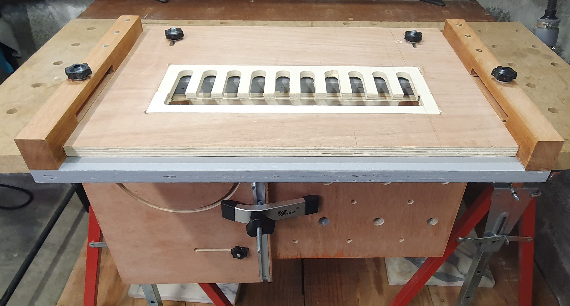 Two DIY router jigs are used